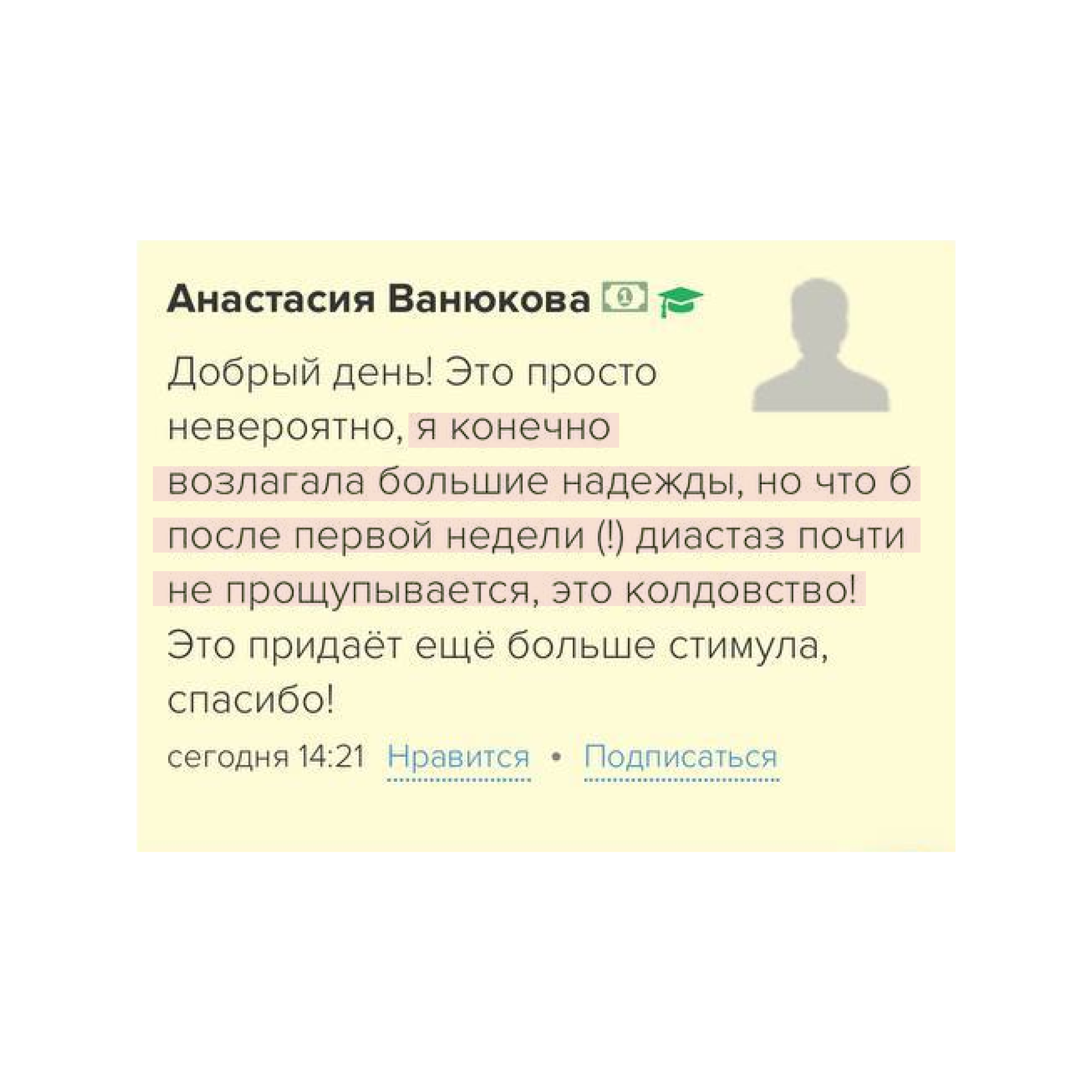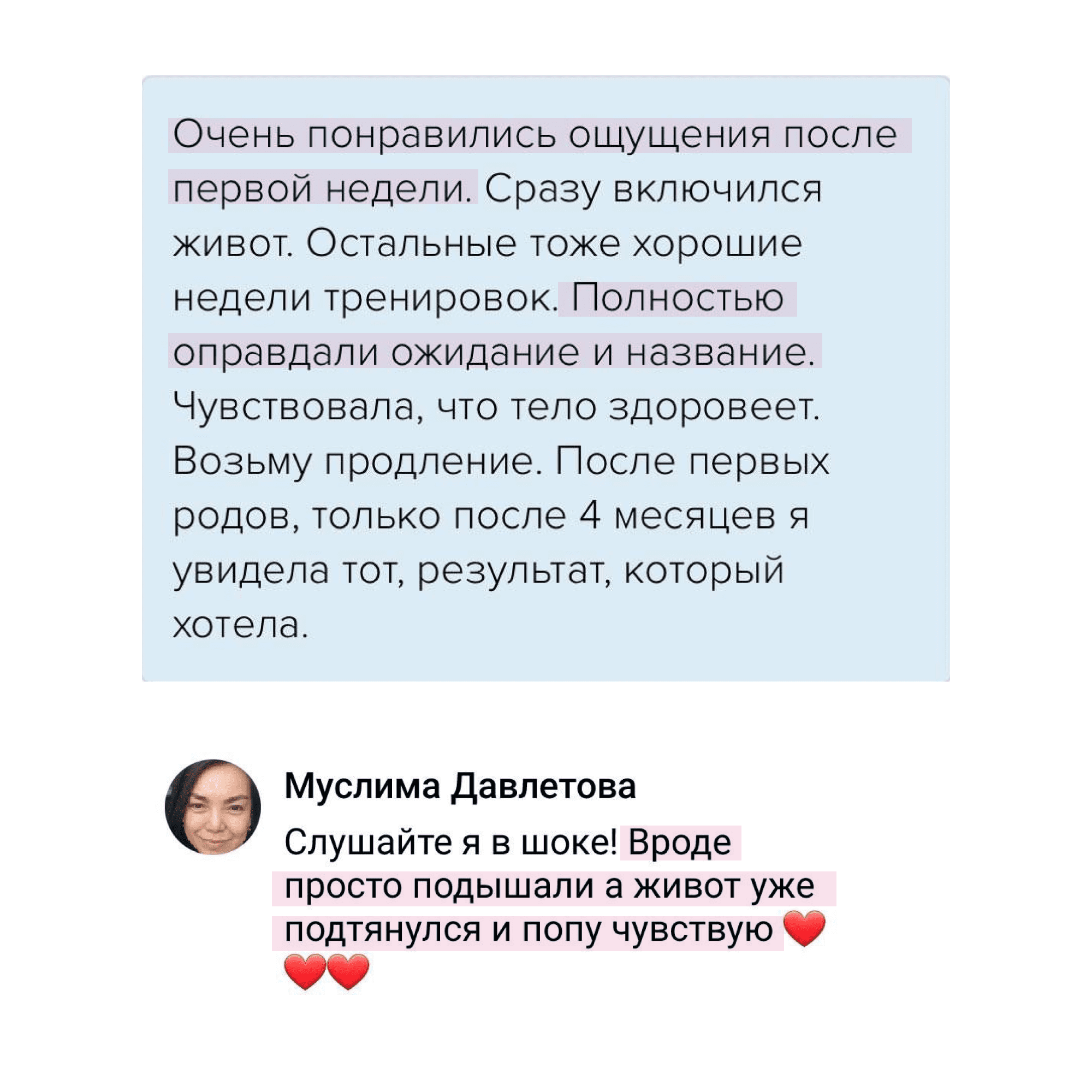 Испытав на себе эффективность тренировок, смело рекомендую своим пациентам. Сначала гинекологическим, а сейчас, с появлением отдельного блока для беременных и послеродовых, рекомендую и акушерским пациенткам.