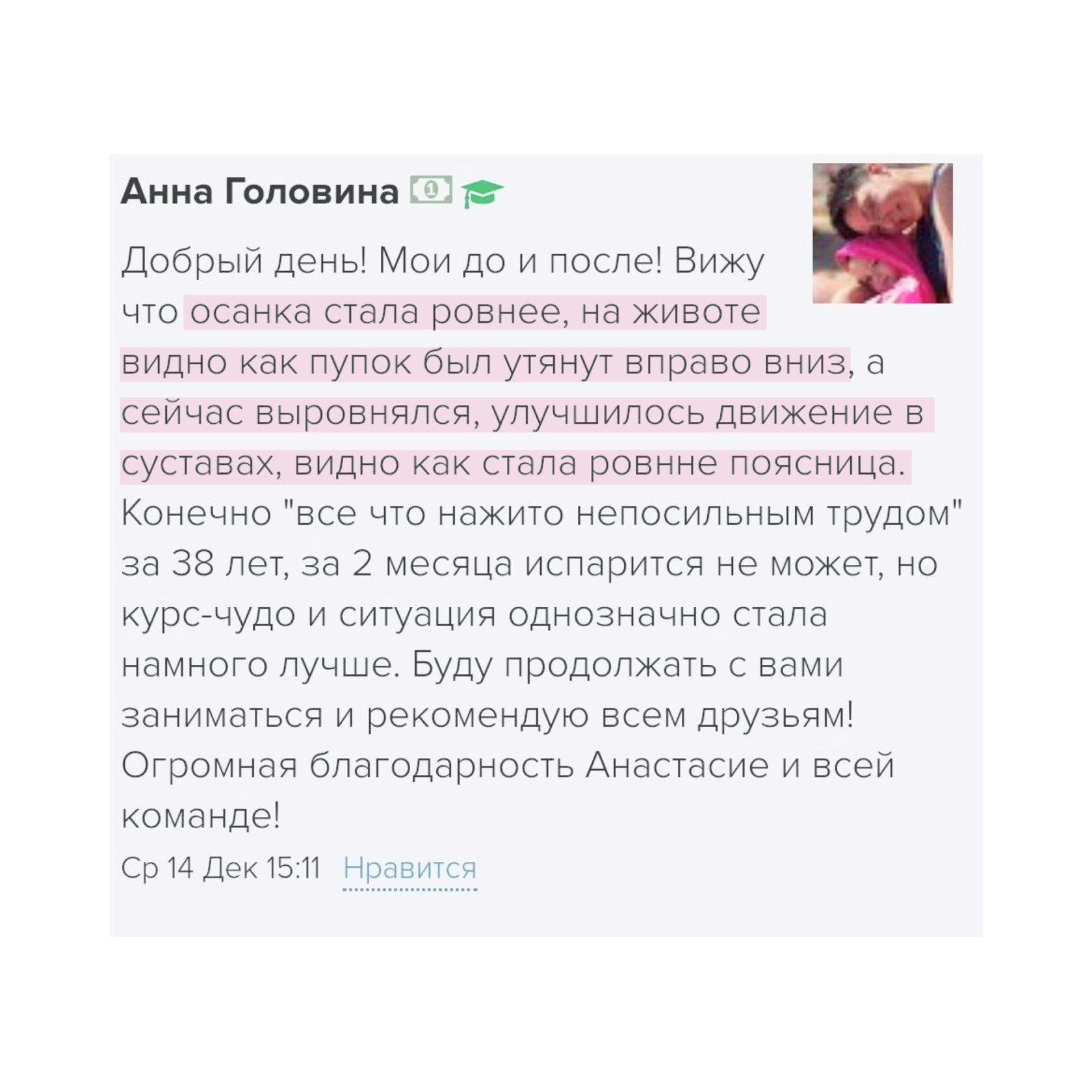 Курс «Здоровое тело» Лунеговой Анастасии это грамотный подход использования теории на практике, помогающей женщинам значительно улучшить качество жизни. Я уверена в этом не только с профессиональной точки зрения, но и как человек, тренировавшийся после родов по программе Анастасии.